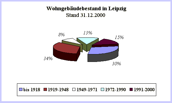 Im „Statistische Jahrbuch 2001 der Stadt Leipzig“ ist folgender Gebäudebestand aus den verschiedenen Jahreszeiträumen zu verzeichnen (siehe Diagramm). Der im Diagramm gezeigte Anteil von ca. 30,1 % entfällt auf Wohngebäude, die vor 1918 errichtet wurden. Davon gehören ca. 18 % in die Gründerzeit. D.h. etwa 12.000 Gebäude mit 100.000 Wohnungen stammen aus dieser Zeit. Die noch fehlenden Anteile verteilen sich auf barocke Wohnbauten vor 1870, Jugendstilgebäude und sonstige Wohngebäude.